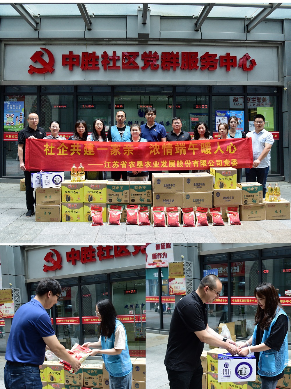 在端午節來(lái)臨前夕,為弘揚中華傳統美德,加大與所轄社區共駐共建力度,營(yíng)造文明和諧的節日氛圍,6月21日,蘇墾農發(fā)到建鄴區沙洲街道中勝社區開(kāi)展“社企共建一家親 濃情端午暖人心”慰問(wèn)活動(dòng),給社區一線(xiàn)網(wǎng)格員們送去慰問(wèn)品和節日祝福。