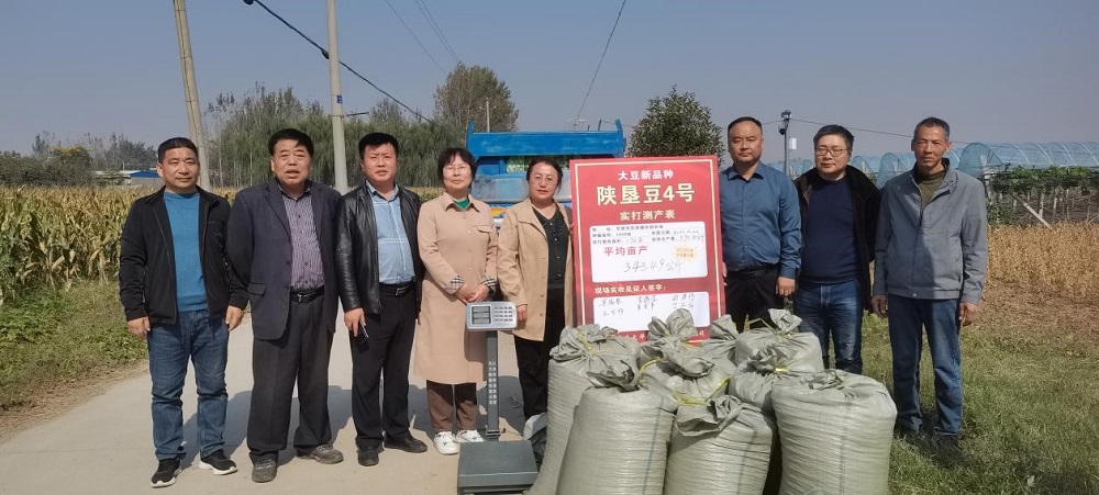 近日,由國家大豆產(chǎn)業(yè)技術(shù)體系延安綜合試驗站站長(cháng)、陜西省豆類(lèi)產(chǎn)業(yè)技術(shù)體系首席專(zhuān)家梁福琴以及陜西省大豆產(chǎn)業(yè)技術(shù)體系專(zhuān)家組成的專(zhuān)家組對陜西農墾大華種業(yè)有限責任公司(簡(jiǎn)稱(chēng)陜墾大華)自有大豆新品種“陜墾豆4號”免耕覆播種植示范田進(jìn)行現場(chǎng)實(shí)收測產(chǎn),畝產(chǎn)達到343.49公斤。