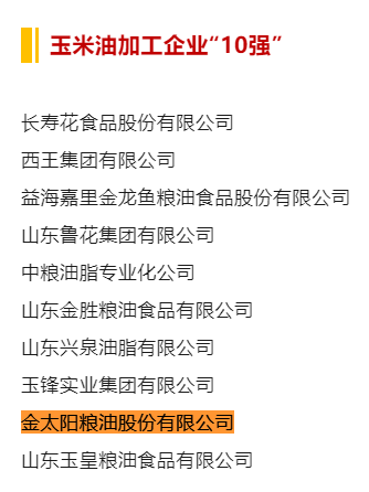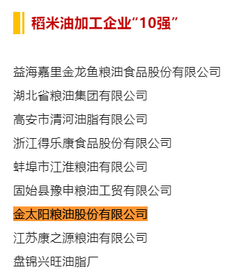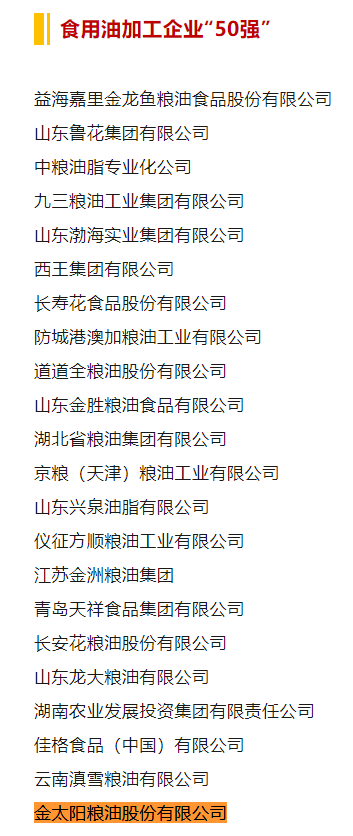 近日,中國糧食行業(yè)協(xié)會(huì )根據《關(guān)于進(jìn)行2024年度重點(diǎn)糧油企業(yè)和各省糧油加工業(yè)專(zhuān)項調查的通知》(中糧協(xié)〔2024〕2號),組織行業(yè)專(zhuān)家開(kāi)展了2023年度重點(diǎn)糧油企業(yè)專(zhuān)項調查,按照產(chǎn)品銷(xiāo)售收入、產(chǎn)量、產(chǎn)能、利稅、利潤等指標綜合審定,公示了2023年度重點(diǎn)糧油企業(yè)專(zhuān)項調查結果。金太陽(yáng)糧油股份有限公司再度入選食用油加工企業(yè)“50強”、玉米油加工企業(yè)“10強”、稻米油加工企業(yè)“10強”、葵花籽油加工企業(yè)“10強”、亞麻籽油加工企業(yè)“10強”等5項榜單,首次入選菜籽油加工企業(yè)“10強”榜單。