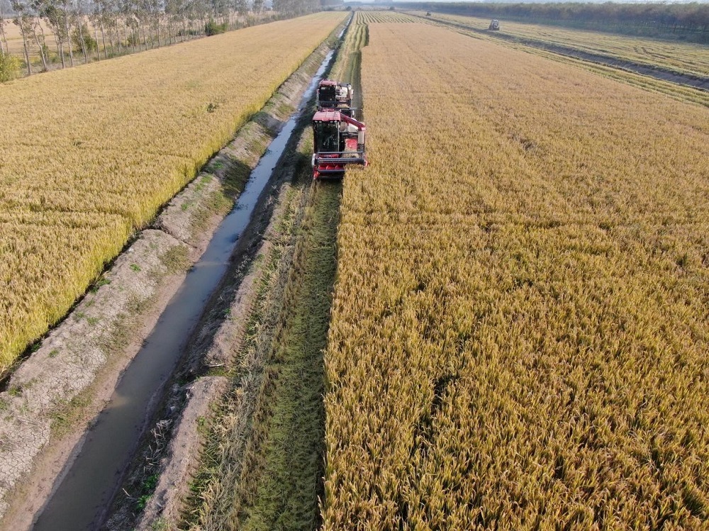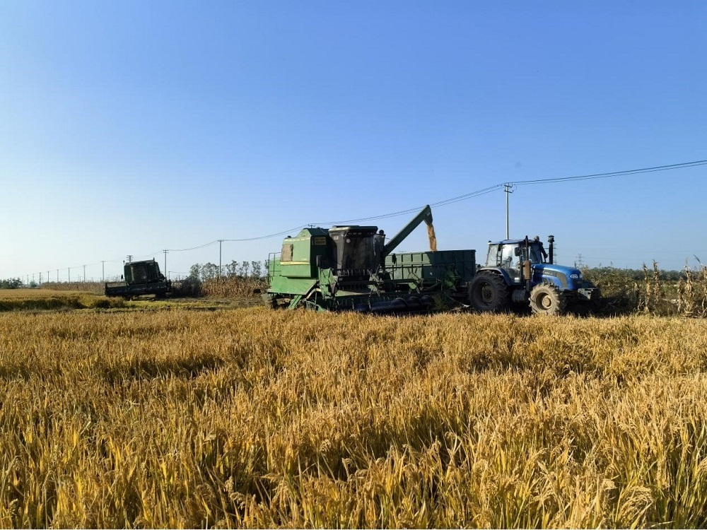 接連成片的稻田上,收割機馬力全開(kāi),運糧車(chē)在田間有序穿梭,收割、脫粒、裝車(chē)一氣呵成。
