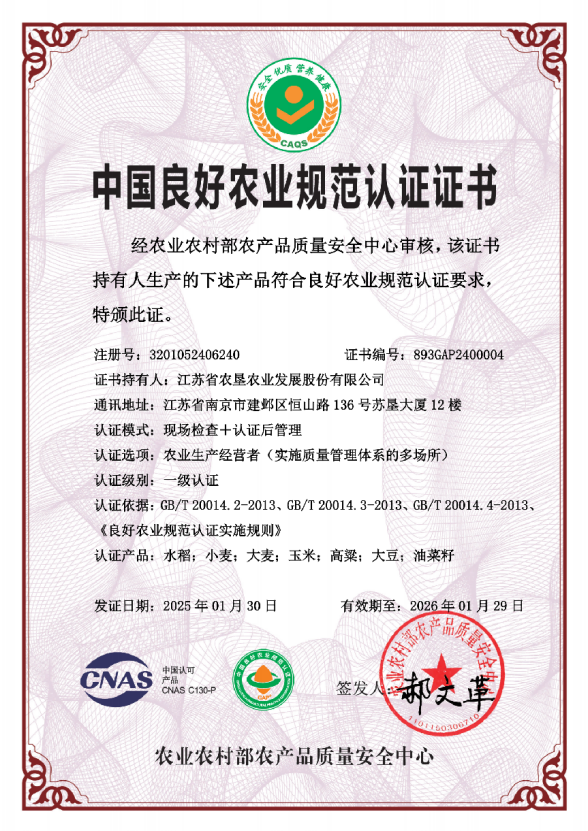 2024年,蘇墾農發(fā)為強化農產(chǎn)品生產(chǎn)全過(guò)程的質(zhì)量與安全管理,提高種植基地農業(yè)生產(chǎn)標準化、規范化和可持續發(fā)展水平,認證并通過(guò)了20家種植基地水稻、小麥、大麥、玉米、大豆、油菜、高粱等7種作物的全國良好農業(yè)規范(GAP)一級認證,率先通過(guò)農業(yè)農村部農產(chǎn)品質(zhì)量安全中心良好農業(yè)規范(GAP)質(zhì)量管理體系的多場(chǎng)所認證,是全國單體規模最大的一級認證單位。一年來(lái),公司依托全產(chǎn)業(yè)鏈縱向一體化管理優(yōu)勢,對種植基地生產(chǎn)環(huán)境質(zhì)量、投入品使用、農產(chǎn)品質(zhì)量控制等方面進(jìn)行嚴格規范化管理,全面提升農業(yè)生產(chǎn)標準化、規范化管理水平,為公司農業(yè)生產(chǎn)可持續發(fā)展提供了保障。